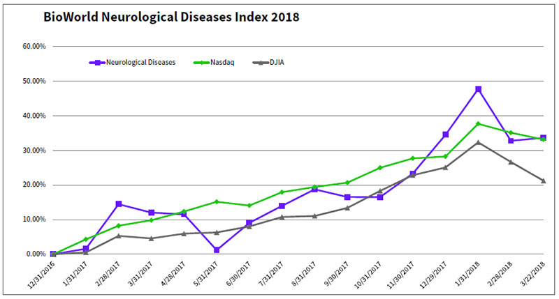 The public markets also have been favorable, with the BioWorld Neurological Diseases index vaulting almost 34 percent since the beginning of last year. So far this year, the companies in the group, like most in the biopharmaceutical sector, have been dragged down by the woes of the general markets, and year-to-date the index is recording a slight drop in value of 0.6 percent.