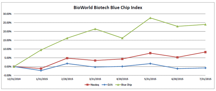 Second quarter financial results for biotechnology companies are coming in thick and fast and overall, for the larger biotech companies at least, their report cards have been positive. However, a few companies failed to live up to expectations. As a result, the BioWorld Blue Chip Index, comprising 20 of the leading companies ranked by market cap, closed July with only a marginal 0.9 percent gain as the gainers just held sway over the decliners. The slight uptick in value kept the index up at 24 percent year to date, well ahead of the general markets with the Nasdaq Composite index posting an 8 percent increase year to date (3 percent gain for the month), while the Dow Jones Industrial Average continues to have a tough year in the wake of a variety of negative macroeconomic factors and remains down 0.8 percent so far this year. (See BioWorld Blue Chip Index, below.)
