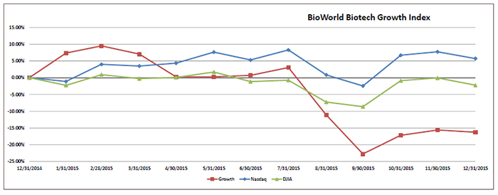Biotech benefited from a calmer, more positive fourth quarter, with the group recording a more than 10 percent jump in value. Nevertheless, it will be a year that most biotech investors will be glad is over, with the uncertain capital markets that saw the Dow Jones Industrial Average lose more than 2 percent in value in the year. The Nasdaq Composite index closed up 5.7 percent for 2015. (See BioWorld Blue Chip Biotech Index, below.)
