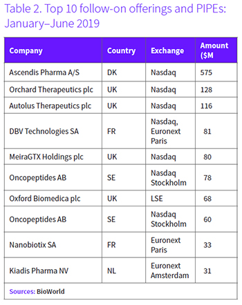 DUBLIN – European biotechnology firms engaged in drug discovery and development raised an aggregate $3.172 billion in equity investment during the first half of 2019, down 19% on the same period last year. Unless there is a substantial pickup in the third and fourth quarters, the sector's record-breaking 2018 total of $7.715 billion looks to be out of reach. (See Table 1, right.)