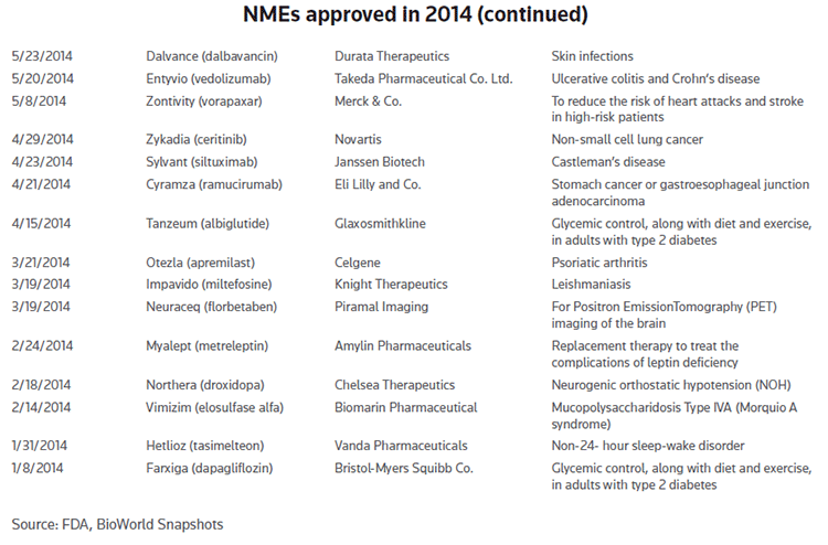 A flurry of FDA drug approvals the week leading up to the holiday break helped boost the total of new molecular entities that rolled out in 2014. The most recent was the Dec. 24 approval of Namzaric, a once-daily fixed-dose combo of Namenda XR and donepezil, for Alzheimer's disease dementia, brought good cheer to Adamas Pharmaceuticals Inc., of Emeryville, Calif. Partnered with Actavis plc (through the Dublin-based firm's buyout of Forest Laboratories Inc.), Namzaric, which combines the NMDA receptor antagonist memantine hydrochloride extended-release drug marketed by Actavis as Namenda with acetylcholinesterase inhibitor donepezil hydrochloride, was cleared for use in moderate-to-severe dementia of the Alzheimer's type in patients stabilized on memantine hydrochloride and donepezil hydrochloride.