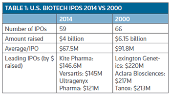 If you look at the chart (see below) of the number of biotech initial public offerings (IPOs) that have been completed annually in the U.S. during the past 15 years, one year stands out above all others – 2000. The 66 IPOs that were concluded that year represents a lasting testimony to the euphoria around genomics and information technology at the time that catalyzed investors to eagerly snap up new offerings in companies focused on biotechnology and drug development.