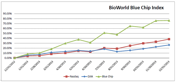 The BioWorld Blue Chip Index, for example, a price-weighted index that includes 21 of the top biotechnology companies by market cap, recorded a 76.25 percent increase in value for the year. The group outpaced the general markets by a wide margin with the performance of the Dow Jones Industrial average and Nasdaq Composite index closing out the year up 22 percent and 33 percent respectively. (See BioWorld Blue Chip Index. below.)
