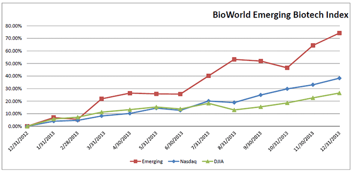 On a wider scale, the BioWorld Stock Report, which tracks the stock prices of the 259 biotechnology companies developing therapeutics listed on U.S. exchanges, reinforces the incredible year for these firms. Collectively their share prices closed up an average of 54 percent. Among the group of companies, 68 percent recorded positive gains in their share price.