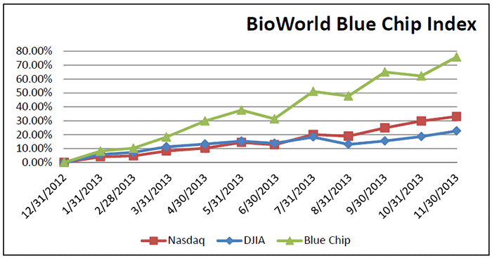 To emphasize what an incredible year it has been, BioWorld’s Blue Chip Index, a price-weighted index that includes 21 of the top biotechnology companies has recorded a 76 percent increase in value, in the same time period and has considerably outpaced the general markets with the Dow Jones Industrial average recording a 22 percent YTD increase and the Nasdaq Composite index a 33 percent increase. (See BioWorld Blue Chip Index, below.)
