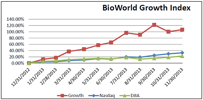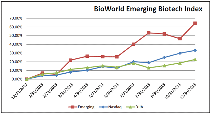 With just one month to go before the end of 2013, the positive trends of our indices still indicate that public biotech companies developing therapeutics remain well on track for a record-setting year.