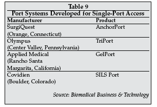 He added, "There are also purpose-built platforms that have all-in-one tools inserted through one port that were originally designed for NOTES procedures but may be able to transfer into the single port environment." (See Table 10)