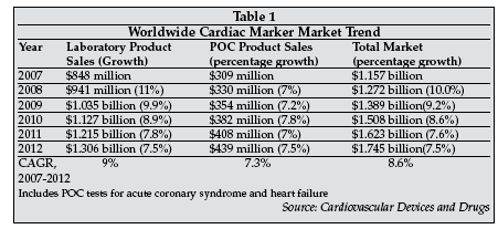 The global market for cardiac markers is in excess of $1.1 billion, as shown in Table 1 About one-third of the market is attributable to sales of point-of-care cardiac marker testing products, with the remainder attributable to products for use in the central laboratory.