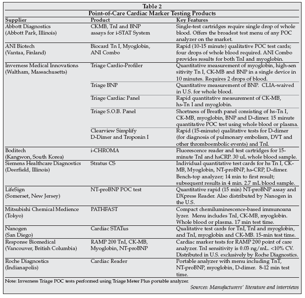 A number of POC cardiac marker testing products are on the market in the U.S., as shown in Table 2. on the next page. Inverness Medical is the leader in the POC cardiac marker segment worldwide with the Triage product line acquired via its acquisition of Biosite. Roche Diagnostics is the No. 2 supplier, with a strong presence in the European market, followed by Siemens Healthcare Diagnostics with a 10% share of the market. Abbott Diagnostics has expanded its presence in the POC cardiac marker segment with the addition of Troponin I, CK-MB and BNP assays to its i-STAT analyzer menu. Sales of the i-STAT system are mainly concentrated in U.S. hospitals, but Abbott plans to expand outside the U.S., initially focusing on Germany and the UK in 2009.