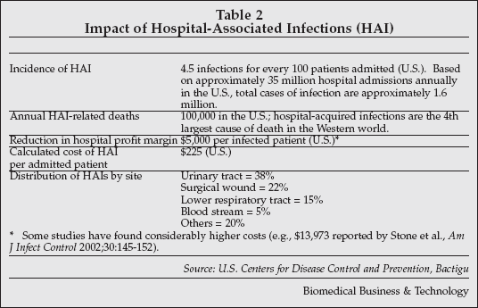 New technologies for prevention of infections in the hospital setting were another highlight at MEDICA.Hospital-associated infections (HAIs) are a major issue in healthcare institutions worldwide, as shown in Table 2 (next page) and are the fourth leading cause of death in the WEstern world. HAI is a particularly iportant concerni n Asia, since 90% of hospital-acquired infections in that region are resistant to antibiotic treatment. Given the high cost of treating patients who develop HAIs, hospitals can justify a significant level of investment in infection prevention, and many companies are now introducing products to address the need.