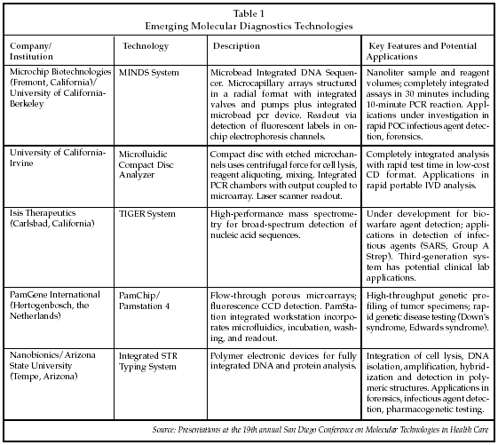 In addition to advances in detection technologies, a number of emerging technologies were described at the San Diego Conference that may allow development of fully integrated microanalytical systems for use in molecular diagnostics. An overview of the technologies discussed at the meeting is shown in Table 1. Richard Mathies, PhD, of the University of California-Berkeley described research with microcapillary arrays that have applications in rapid genotyping using nanoliter to subnanoliter sample and reagent volumes. The arrays are fabricated in a radial configuration, and include integrated nanoliter valves, on-chip electrophoresis channels and a polymer capture gel for purification, heated chambers for performing pcr reactions and microbeads with primers attached for performing sequencing using the Sanger reaction, all on a single chip. Mathies is collaborating with Microchip Biotechnologies (Fremont, California), which is planning to commercialize the technology. Initial efforts are focused on development of a portable device for infectious disease testing, and assays for E. coli 157:H7 and E. coli 055:B5, as well as for methicillin-resistant staphylococcus aureus, have been prototyped which offer a 30-minute turnaround time. Another application under development is forensic testing with a portable system configured as an integrated microfluidic short terminal repeat analyzer (GATTACA-TO-GO). Microchip Biotechnologies and Mathies are collaborating with the Division of Forensic Science of the State of Virginia and with the Palm Beach, Florida, Sheriff's Office to implement the technology for forensic applications. A rapid PCR assay for sex determination using a bucchal swab sample has been developed that involves collecting the sample with a swab, placing the swab into a hot PCR mix, and then applying the resulting mixture to the chip analyzer. It also may be possible to use blood samples in the analyzer, according to Mathies, although issues arise due to interference by heme proteins with the PCR reaction. One solution may be to collect the blood samples with microneedles to eliminate red blood cells as part of the sampling process.