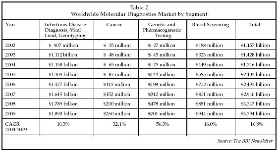 The expanded array of technologies applicable to molecular diagnostics, as well as advances in disease-related gene discovery and improvements in bioinformatics technology for analyzing test data, have engendered growth in the number of applications of molecular diagnostics in the clinical lab. Although the molecular diagnostics market was initially limited almost entirely to applications in infectious disease testing, there recently has been a rapid expansion in the uptake of new applications in the areas of genetic testing, cancer diagnosis, and pharmacogenetics. As discussed at the conference by Deborah Payne, PhD, director of the molecular diagnostics laboratory at the University of Texas Medical Branch (Galveston, Texas), there has been a dramatic increase in physician orders for new molecular tests within the past two years. Payne's laboratory serves a geographic area that covers about one-third of Texas, and performs an average of 1,800 tests per month. Although infectious disease tests still comprise the majority of the total, the number of genetic tests per month has increased by 600% since the beginning of 2004, and the number of pharmacogenetic tests has increased 100% to 75 per month. In addition, the number of solid tumor tests has increased 300% over the past two years, to about 300 per month. As shown in Table 2 below, growth rates in the global market for molecular diagnostic testing products reflect similar trends, with projected growth rates for cancer and genetic/ pharmacogenetic products far outpacing the growth in the infectious disease segment. The global market is expected to exceed $1.7 billion in 2004, and sales will approach $3.8 billion by 2009.