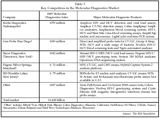 New molecular diagnostic tests for infectious disease also were described at the San Diego Conference. The infectious disease segment continues to represent the majority of the global market and is the primary focus of the major suppliers of molecular diagnostic products, which are listed along with their 2003 global sales and key products in the molecular diagnostics market in Table 3. While some of the market leaders offer products for genetic testing or pharmacogenetics, their revenues in segments other than infectious disease are not significant at present. Some of the suppliers in the "Other" category, such as the Vysis (Downers Grove, Illinois) unit of Abbott Diagnostics (Abbott Park, Illinois), Third Wave Technologies (Madison, Wisconsin) and Celera Diagnostics (Alameda, California), are focusing on the emerging market segments, however. In the infectious disease segment, new tests for viral load and viral genotyping are attracting strong interest, and comprise some of the most rapidly growing subsegments of the market.