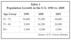 In 1990, citizens over age 65 made up about 13% of the total population in the U.S., according to Census Bureau data. By 2000, at the end of our forecast period, age 65 and older citizens will increase by only 1%. By 2010, the percentage of older citizens will increase by an additional 1% but thereafter climb remarkably. The numbers in Table 2 indicate the elderly population growth during the forecast period. Notice the rate of growth, which also will imply a growth in the demand for services for diseases associated with aging. This suggests that there will have to be some modest expansion in medical devices starting at the end of the survey period, and also that occupancy will rise. Those in the oldest group (85+) make the greatest demands on the health care system, but fortunately they do not rise as rapidly as the growth of the younger/old group.